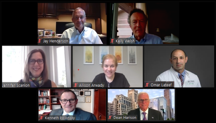 On June 29th, the Commercial Club hosted a webinar moderated by Commercial Club Chair Jenny Scanlon and featuring guest speakers Dr. Allison Arwady, MD, MPH, Commissioner of the Chicago Department of Public Health, Dean Harrison, President and CEO at Northwestern Memorial HealthCare, Dr. Omar Lateef, CEO at Rush University Medical Center, and Dr. Kenneth Polonsky, Dean of the Division of the Biological Sciences and Pritzker School of Medicine and President of the University of Chicago Health System.